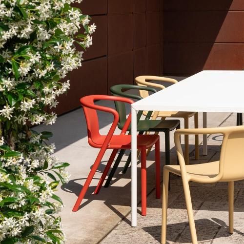 屋外使用にも対応。座面の穴は、水はけの良さと持ちやすさを考慮したディテール。最大10脚までスタッキング可能です。