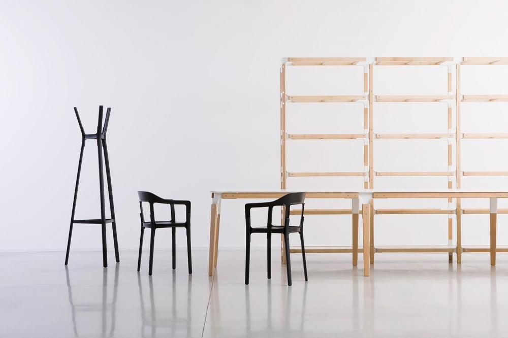 2009年には Steelwood Table、Shelving System、2010年には Steelwood Stool と Coat Stand が発表され、 チェアと同様のスチールジョイント構造をもつシリーズとして展開されました。